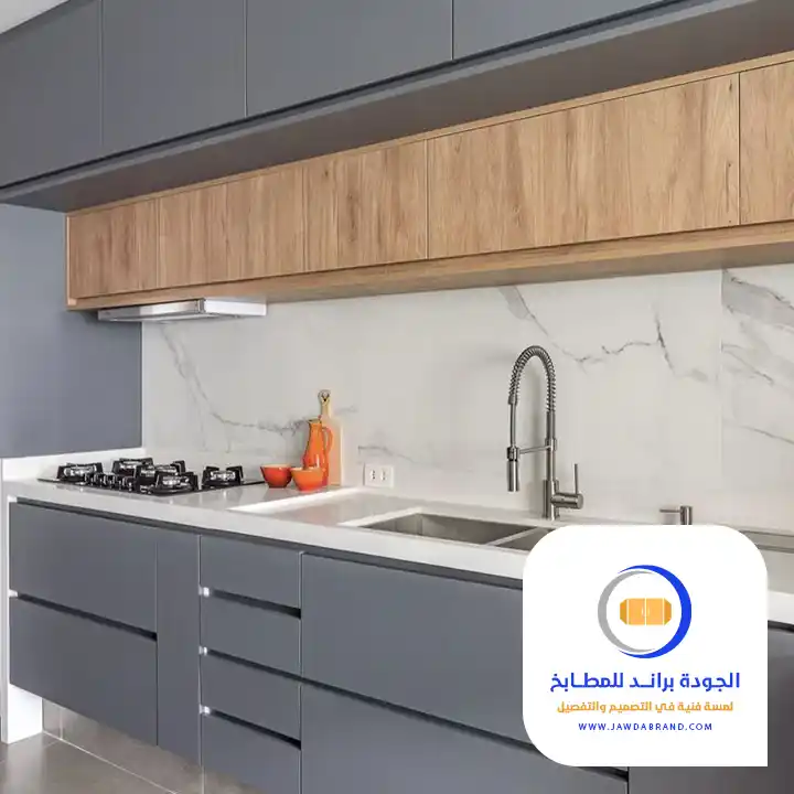 تصميم مطبخ ألمنيوم رمادي مع تفاصيل خشابية دافئة يجمع بين العملية والشكل العصري